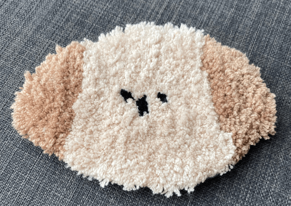 Have you ever seen a carpet the size of your hand before? Made by an 11 year old? In the style of a Cavoodle with cream fur and brown ears?